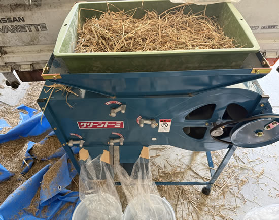 農薬・除草剤・化学肥料を一切使わずに米づくりを行い、収穫はバインダーを使い、その後は米の甘みが増すと聞き、天日干し。米の水分量も計測し、乾燥させた後、足踏み脱穀機で脱穀を行いました。