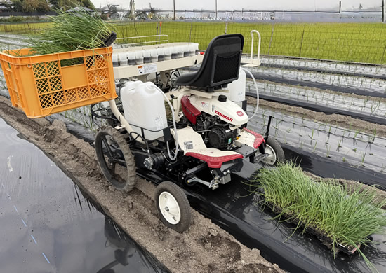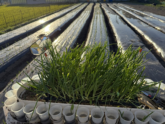 定植前には、玉ねぎの移植をしやすくするために電動ガーデントリマーで苗を切っていました。しかし実際にやってみると、最終的には機械の上で再度切り直す事を行っていました。そこで電動トリマーを使うのをやめて、玉ねぎの移植機に乗った状態で苗を切り、2度切る事をやめて少しだけですが作業の短縮にもなりました。